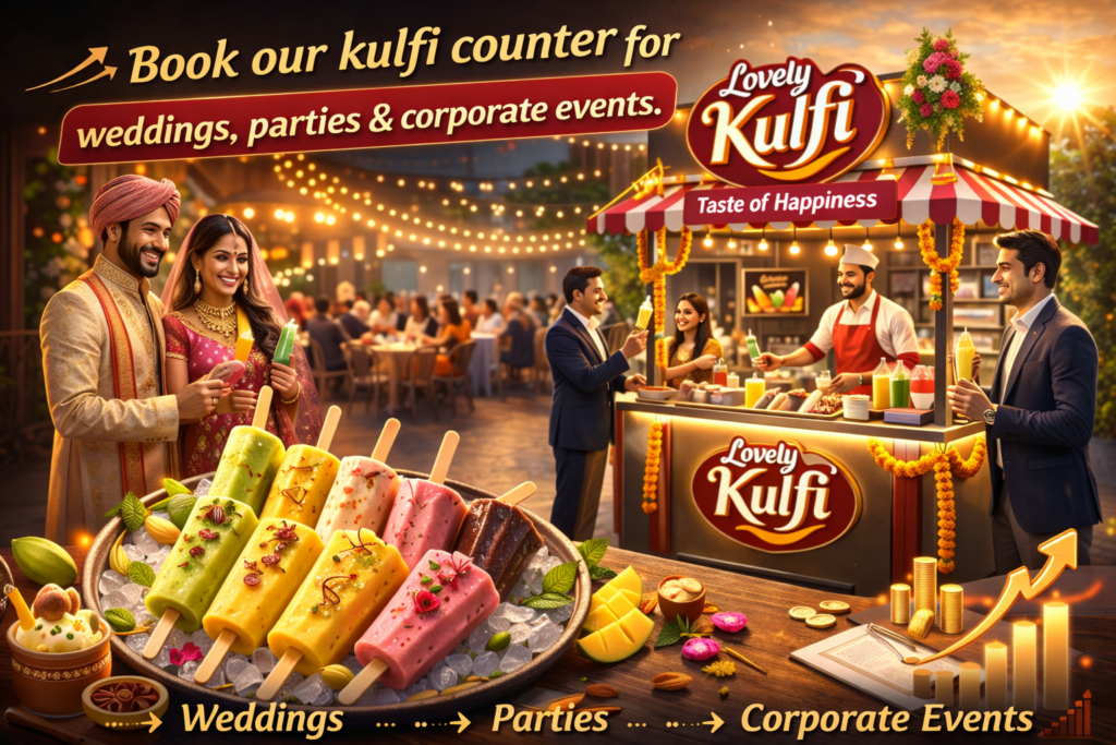 Add a delightful touch to your weddings, parties, and corporate gatherings.Our livekulfi counter creates a unique and memorable dessert experience.We offer a wide variety of authentic and premiumflavors.Professional setup withattractiveprtation and hygiene standards.Customizable packages to suit events of any size.Let Lovely Kulfi turn your special occasion into a sweet celebration.
